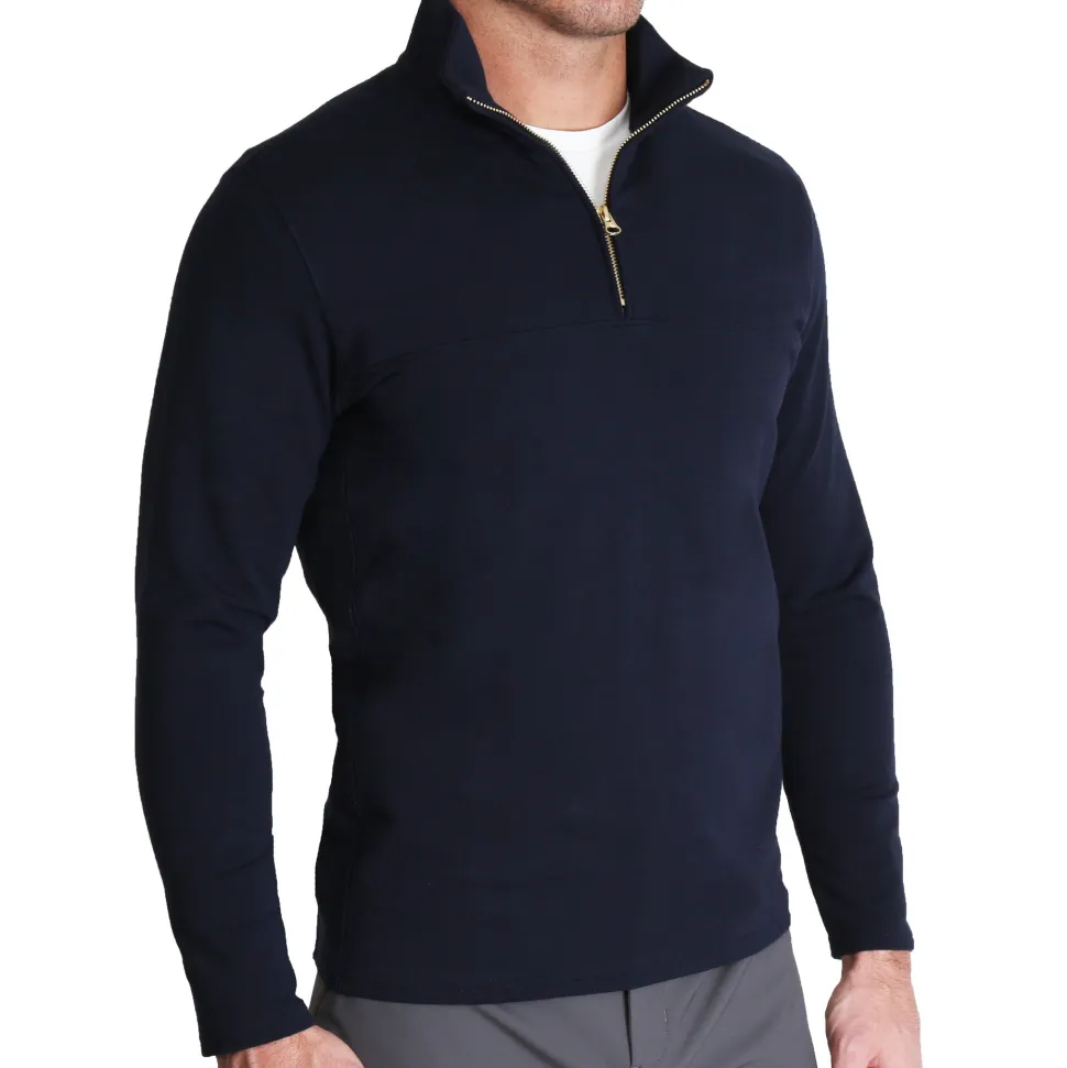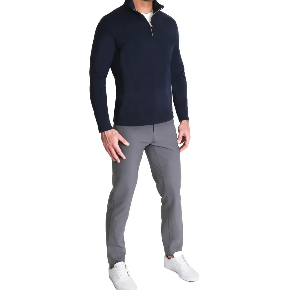 A true athletic fit quarter-zip crafted from absurdly soft and stretchy performance fabric. This quarter-zip puts a modern look on a classic sweater – it pairs well with our dress clothes and looks great with our tech chinos. This quarter-zip will be your go-to layer from the office to the first tee and everywhere in between.