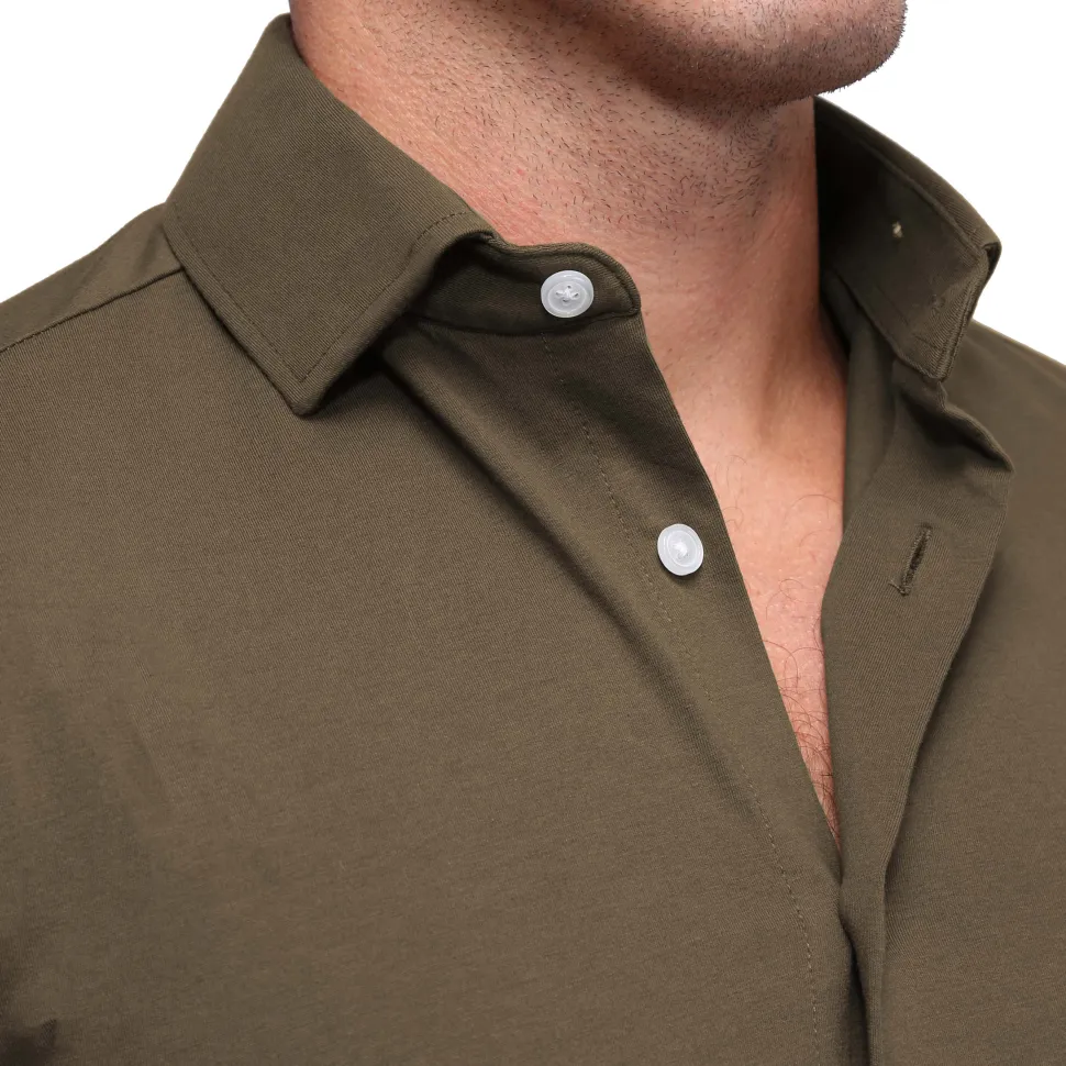 Our signature athletic fit, cotton button downs are crafted from a buttery soft, and breathable stretch fabric. The knit finish puts a modern twist on a classic style, and the structured cuffs and collars provide a clean and polished look. This shirt can be worn tucked in or out, and the stretch in the fabric allows for a close-fitting, modern, tailored look without sacrificing comfort.