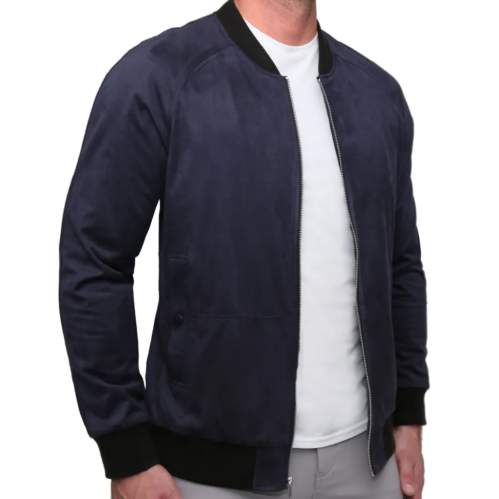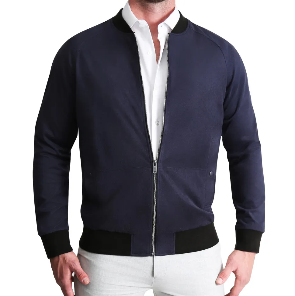 Our stretch bomber jacket is an ideal jacket for a versatile look whether you are looking to dress it up or down. Featuring a ribbed collar, cuffs, and hem, this athletic fit jacket is stylish and extremely comfortable. Pair it with our chinos, jeans, or dress pants for a casual yet sophisticated look.