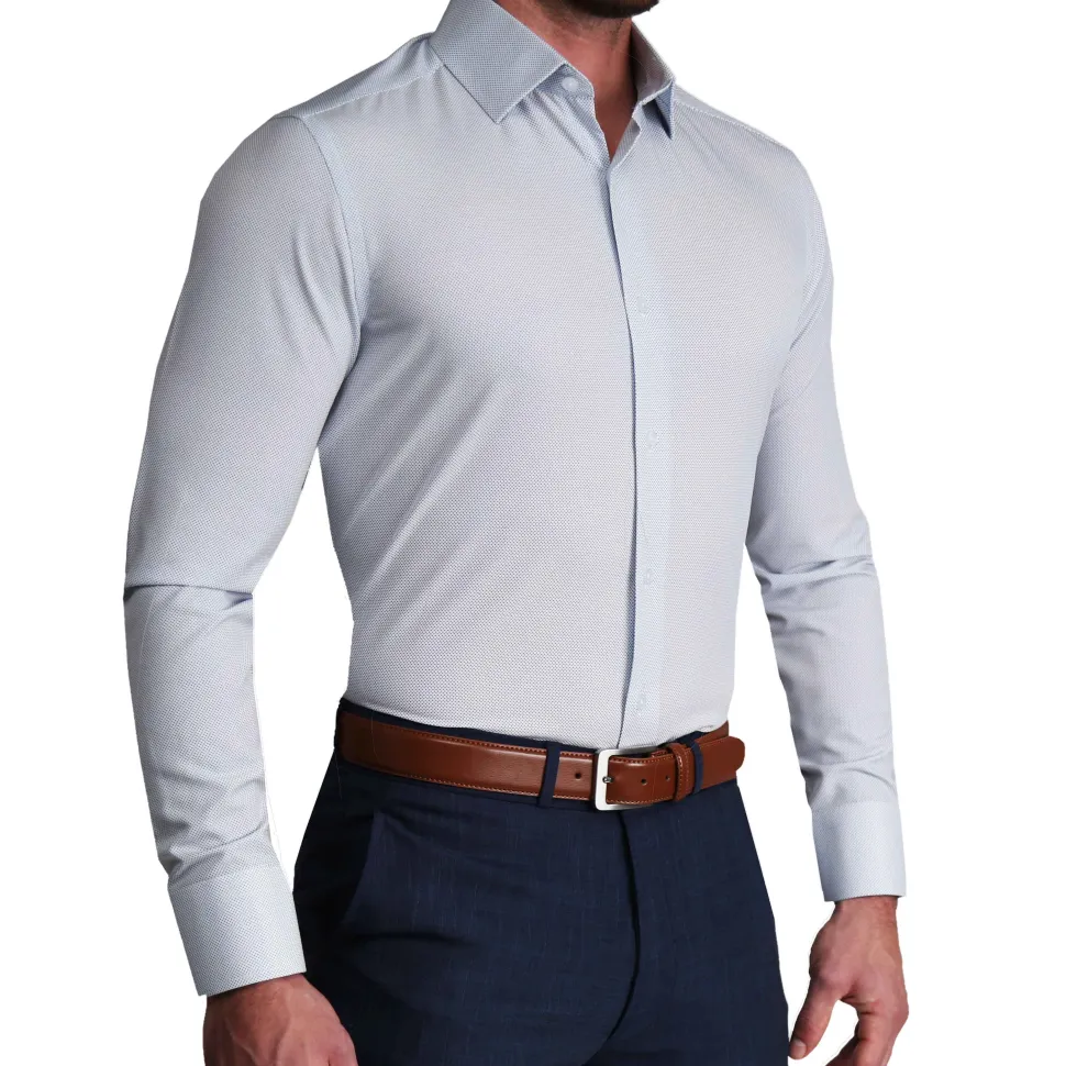 Our Signature Athletic-Fit Dress Shirts are crafted from our Pro Performance Fabric that is lightweight, moisture-wicking, and extremely stretchy. The smooth, woven finish combined with the structured cuffs and collars provides a sharp, professional look, and the stretch in the fabric allows for a close-fitting, modern, tailored look without sacrificing comfort.